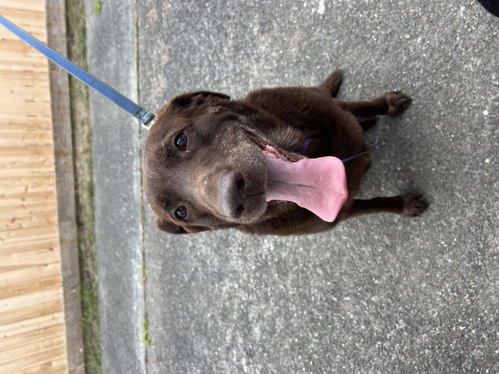 Description | Retriever brown very well cared for. Purple ribbon around her neck, verrry clean teeth. She walked into our yard when we opened the gate. EST of age 8ish, grey muzzle. |