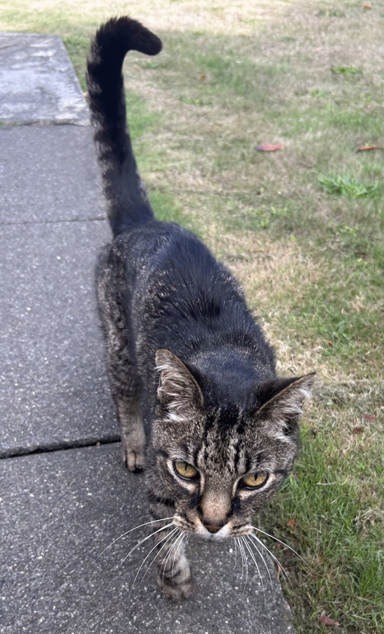 | Description | A friendly male cat without any collar or ID tag has been visiting our yard recently (about two weeks now). He’s a dark gray tabby with speckled golden eyes. He’s currently very skinny, but otherwise seems to be in good health. He’s comfortable around humans and wants to come inside, suggesting he may have been an indoor cat. |