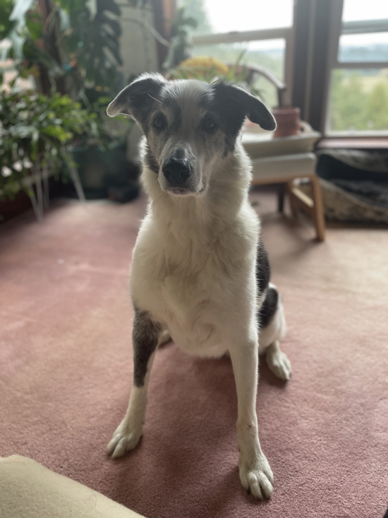 | Description | Mooky is a border collie husky mix, mainly white with black areas. She has a scar on her snout. She escaped her fence. |