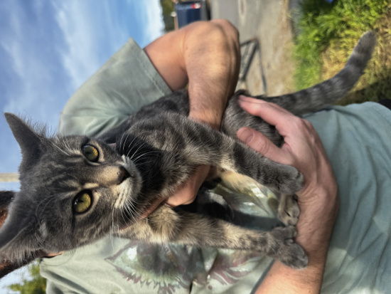 | Description | Little grey kitten found in Blue Lake on F street. Dark and light grey stripes, extra toes on both front paws. Very friendly!! |