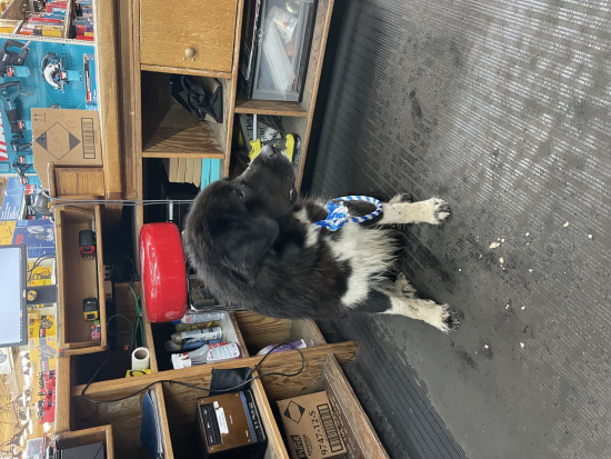| Description | Newfoundland, black and white very sweet dog blue collar |