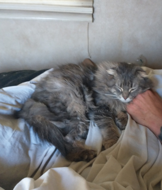 | Description | Gray Scottish fold female cat looks like she has no ears and her tail is about half as long as normal house cats.her front feet have fur sticking out between the toes.shes small about 5lbs |