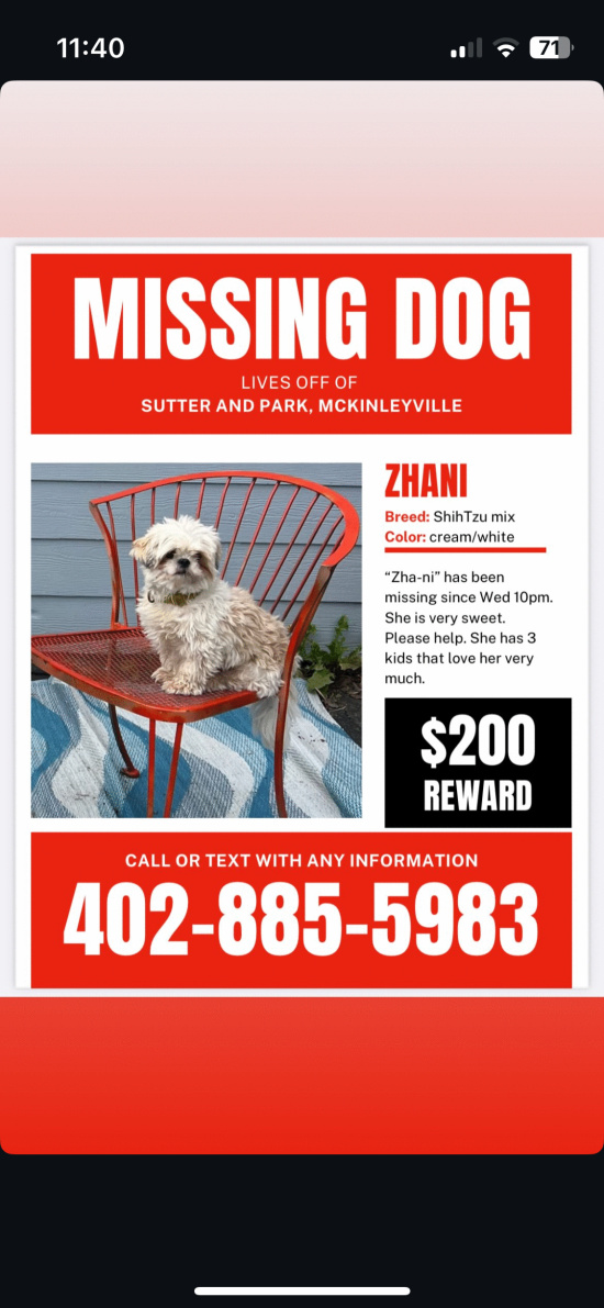 | Description | Small white dog, super friendly, lost in mcKinleyville off of Sutter and Park. |
