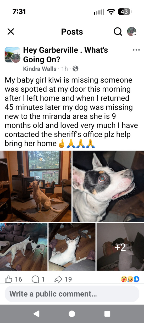 | Description | My baby kiwi is 9 months old white with black dots on the back of her ears and brown and black patch on one side of her face. She was home when I left in the house to take my kids to school and when I came back my door was open and she was gone and my neighbors stated that they saw somebody on my porch and thought it was my kid but all my kids were with me |