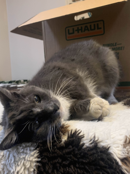 | Description | Very friendly young grey cat with a white chin, tummy, paws, and diamond shape between his green eyes. We think he’s a boy. He has very short whiskers. Hard to tell if he is a kitten or just underweight.