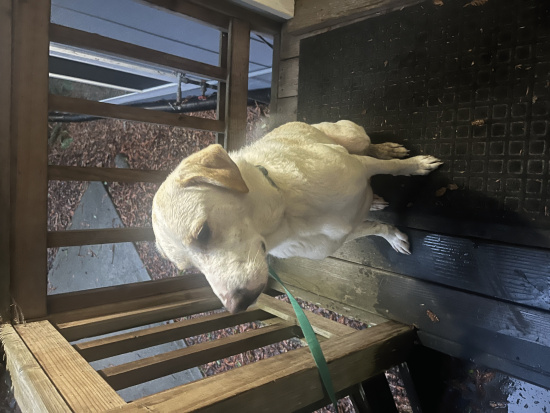 | Description | White and tan large dog with a collar, but no name found in the community forest near Fickle Hill. |