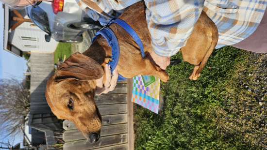 | Description | Sweet intact male brown dachshund very friendly wearing a blue harness without tags |