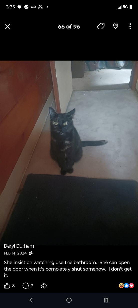 | Description | Lucy is a black cat with brown markings. She is a tortoise shell breed. she has a skinny spot with less hair at the base of her tail. I recently moved to 4th Street in Arcata and she ran towards 5th st. behind CVS and Safeway. She is very vocal especially when hungry. |