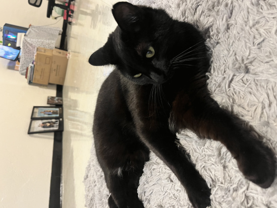 | Description | Super seeet black cat found at the Woodbridge apartment complex. Wears a sun and moon collar with a kinked shortened tail. |