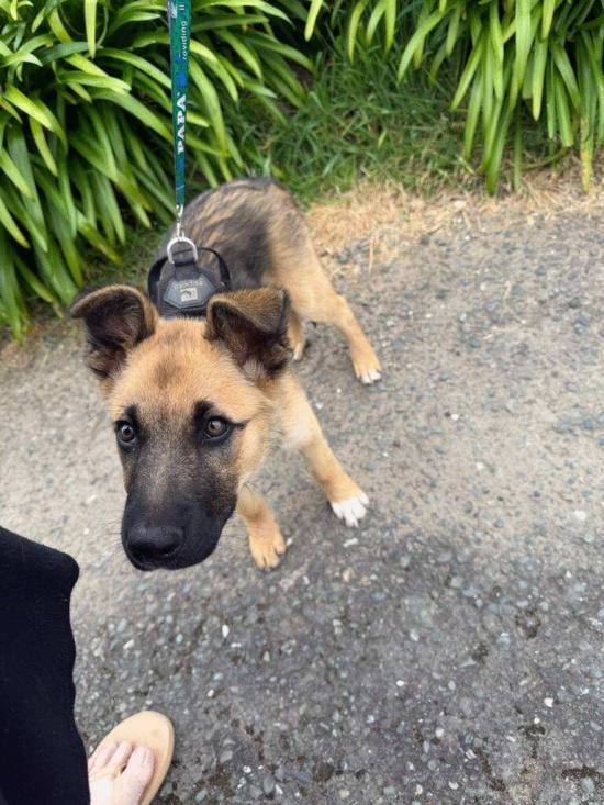 | Description | Small puppy, looks to be a German shepherd mix. Front left paw is white. Floppy ears, sits on command. Has an rcpets harness on. |