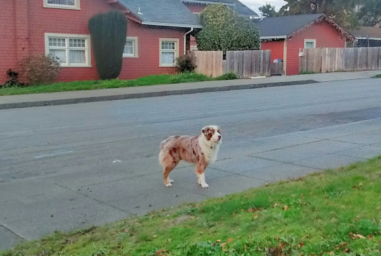 | Description | Australian shepherd. Nice looking doggie. Too skittish to catch, hanging around near my house. |